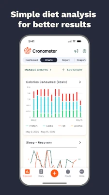 Import sleep data from various devices and access sleep metrics in the Diary, Dashboard, and Charts. Analyze sleep duration, stages, recovery, and correlations with nutrition, such as the effects of alcohol or caffeine.