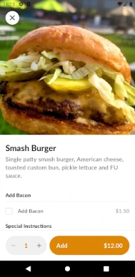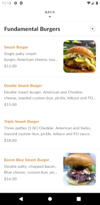 With the FU Burger app, you can: • Browse our menu for your favorite dishes and customize them how you'd like • Save your delivery addresses and payment methods securely to check out in just a few taps • Place future food orders up to seven days in advance • Get restaurant location, hours, and contact information