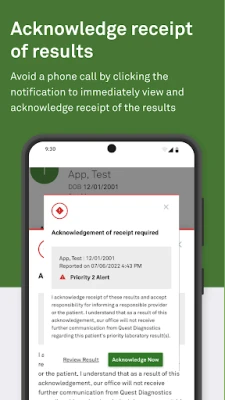 Quest Lab Alert for Physicians is a companion to the Quanum® Lab Services Manager application, both providing access to the same Priority and STAT results notifications. When a notification is received, you can click the notification to immediately view and acknowledge the results within the app. Results that are acknowledged via Quest Lab Alert for Physicians display the same acknowledgement message that appears when they are acknowledged within the Quanum Lab Services Manager application.