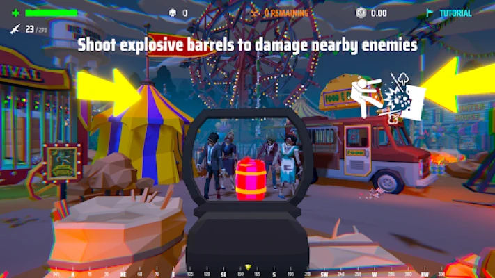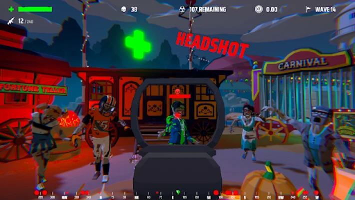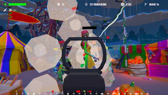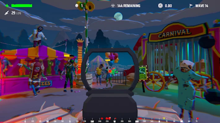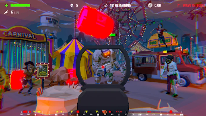 The low-poly horror aesthetic is optimized for mobile, delivering a unique, stylized shooter experience unlike any other. Battle through the continuous, progressive wave system, where endless zombie threats emerge from the dark carnival. Face specialized threats like the Alpha Zombie Bosses, requiring precise aiming and tactical movement to master AR survival.